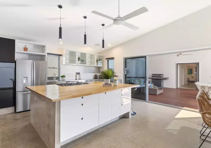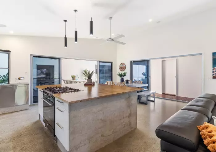 Whilst the exterior as you enter offers beautiful wooden decking, once you enter into the open-plan living quarters, you will be greeted by high ceilings, and polished concrete floors. The kitchen is simply a work of art, offering diverse design elements, boasting a large island bench, which just lends itself to conversing with others as you cook scrumptious meals. The light filled dining room is cleverly positioned between two double sliding doors on either side, which almost brings the outside in. The sizeable lounge area complements the living space, and you can imagine watching a movie with the surround sound on and finding comfort knowing the bedrooms are on the other side of the house, and the children will not be disturbed.