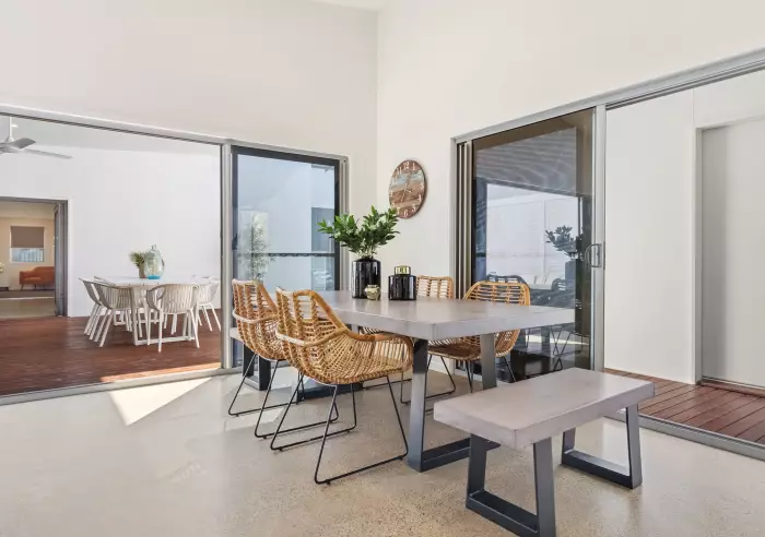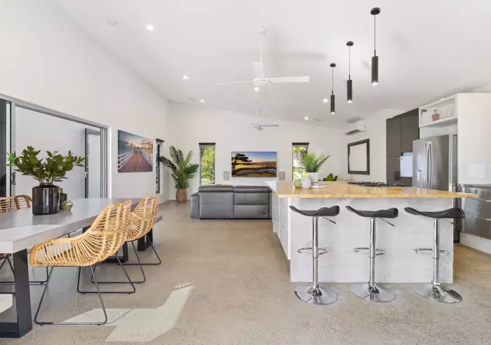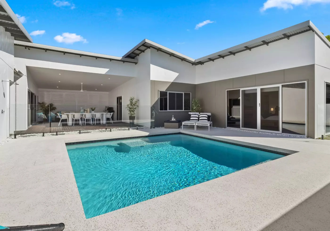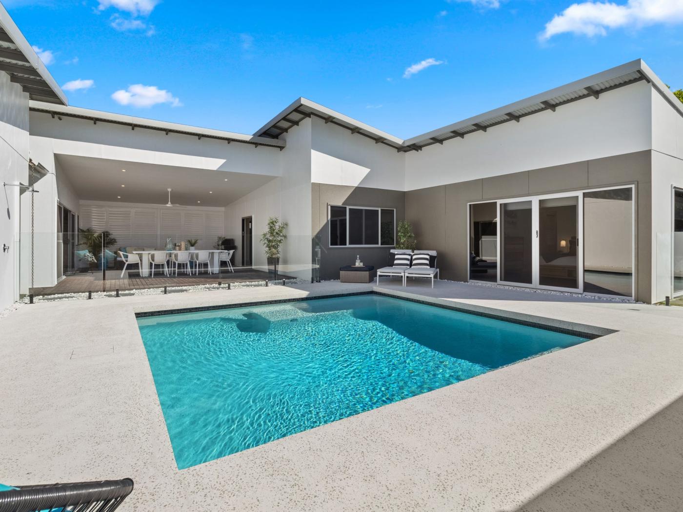 Situated in a peaceful pocket of Peregian Springs. This upmarket modern contemporary family home offers a bespoke floorplan. Offering 2 separate wings of living and sleeping quarters, separated by a gorgeous entertainer's patio, overlooking a sparkling blue swimming pool, surrounded by the most exquisite polished concrete, it's simply beautiful.