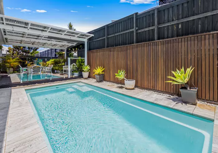 The modern kitchen boasts a butler’s pantry and a clever serving hatch to the alfresco area, perfect for effortless entertaining. The adjoining open-plan lounge and dining areas flow seamlessly to the large covered patio overlooking the swimming pool.